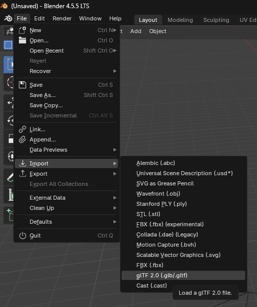 - In Blender, go to File > Import > glTF 2.0 (.glb/.gltf)